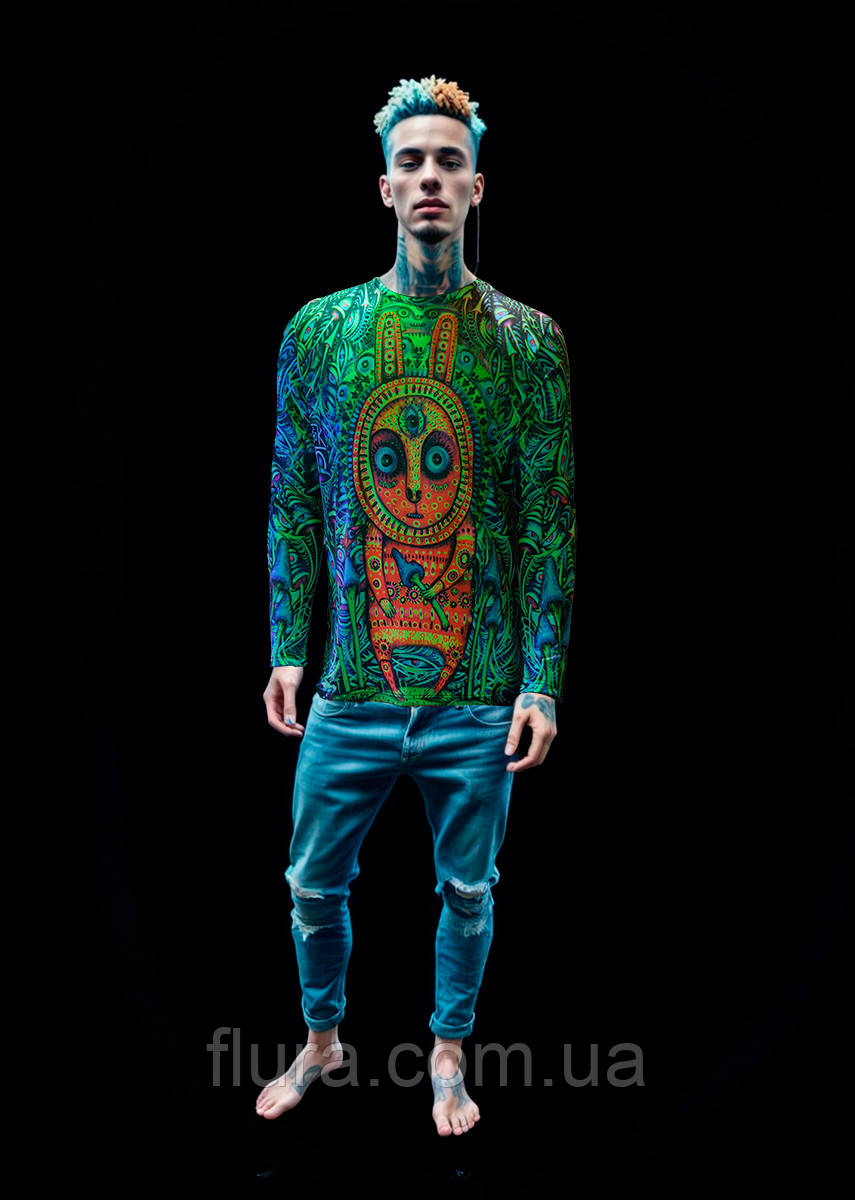 І ось наш старий – новий “Зайченятко” на футболці. Повністю флуоресцентний, запечатаний, з флуоресцентною сублімацією, дизайн.